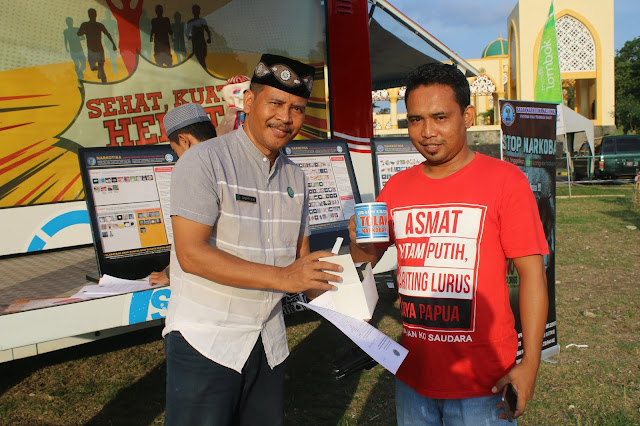 Kepala Bidang P2M BNNP NTB AKBP Cheppy Ahmad Hidayat, S.Ag membagikan souvenir Tolak Narkoba kepada pengunjung Bazzar "Pesona Khazanah Ramadhan 2018" di Halaman Masjid Hubbul Wathan Islamic Centre NTB, sabtu (26/5).